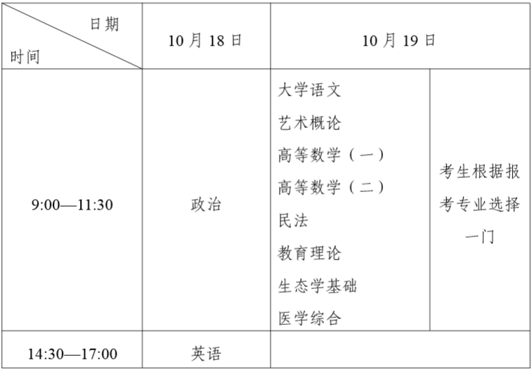 1.高起專(zhuān)、高起本不分文理科,考試科目為:語(yǔ)文、數(shù)學(xué)、英語(yǔ)。2.專(zhuān)升本考試科目為3門(mén)。(1)文史、中醫(yī)類(lèi),含哲學(xué)、文學(xué)、歷史學(xué)以及中醫(yī)學(xué)類(lèi)、中藥學(xué)類(lèi),統(tǒng)考科目為:政治、英語(yǔ)、大學(xué)語(yǔ)文。(2)藝術(shù)類(lèi),統(tǒng)考科目為:政治、英語(yǔ)、藝術(shù)概論。(3)理工類(lèi),含工學(xué)、理學(xué)(生物科學(xué)類(lèi)、地理科學(xué)類(lèi)、心理學(xué)類(lèi)等除外),統(tǒng)考科目為:政治、英語(yǔ)、高數(shù)(一)。(4)經(jīng)濟(jì)管理類(lèi),含經(jīng)濟(jì)學(xué)、管理學(xué)以及生物科學(xué)類(lèi)、地理科學(xué)類(lèi)、心理學(xué)類(lèi)、藥學(xué)類(lèi)等,統(tǒng)考科目為:政治、英語(yǔ)、高數(shù)(二)。(5)法學(xué)類(lèi),統(tǒng)考科目為:政治、英語(yǔ)、民法。(6)教育學(xué)類(lèi),統(tǒng)考科目為:政治、英語(yǔ)、教育理論。(7)農(nóng)學(xué)類(lèi),統(tǒng)考科目為:政治、英語(yǔ)、生態(tài)學(xué)基礎(chǔ)。(8)醫(yī)學(xué)類(lèi),中醫(yī)學(xué)類(lèi)、藥學(xué)類(lèi)等兩個(gè)一級(jí)學(xué)科除外,統(tǒng)考科目為:政治、英語(yǔ)、醫(yī)學(xué)綜合。